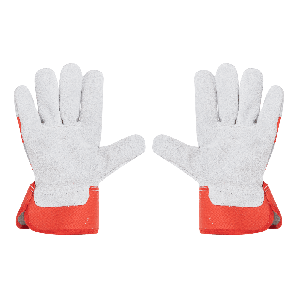 SPLIT LEATHER PALM GLOVE, WITH RED 7 CM RUBBERISSED CUFF & BACK HALF LINNED ,STYLE 3 TIPS,