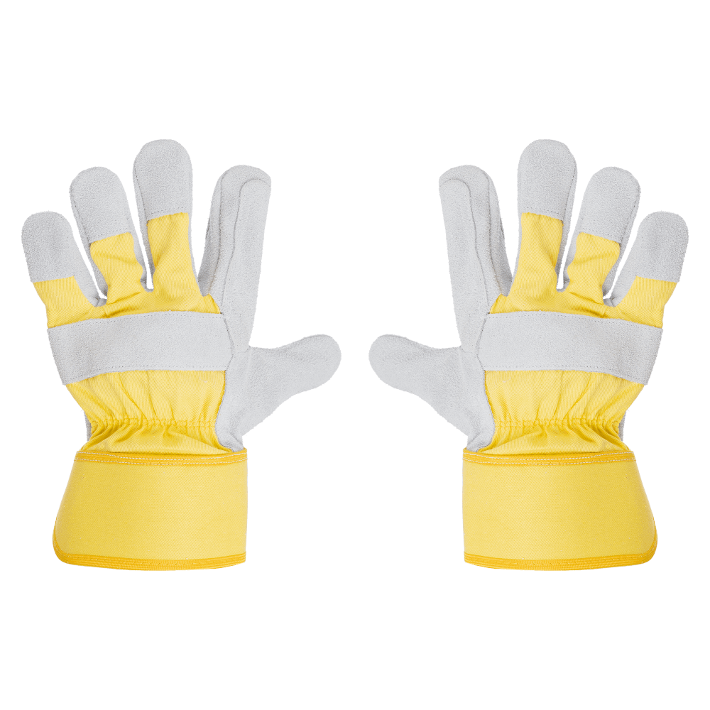 SPLIT LEATHER PALM GLOVE REINFORCEMENT ON PALM THUMB & INDEX FINGER WITH NATURAL COLOUR SPLIT LEATHER, 7CM YELLOW RUBBERISSED CUFF, HALF LINNED ,CUFF AVAILABLE IN MULTIPLE COLOURS, STYLE 3 TIPS